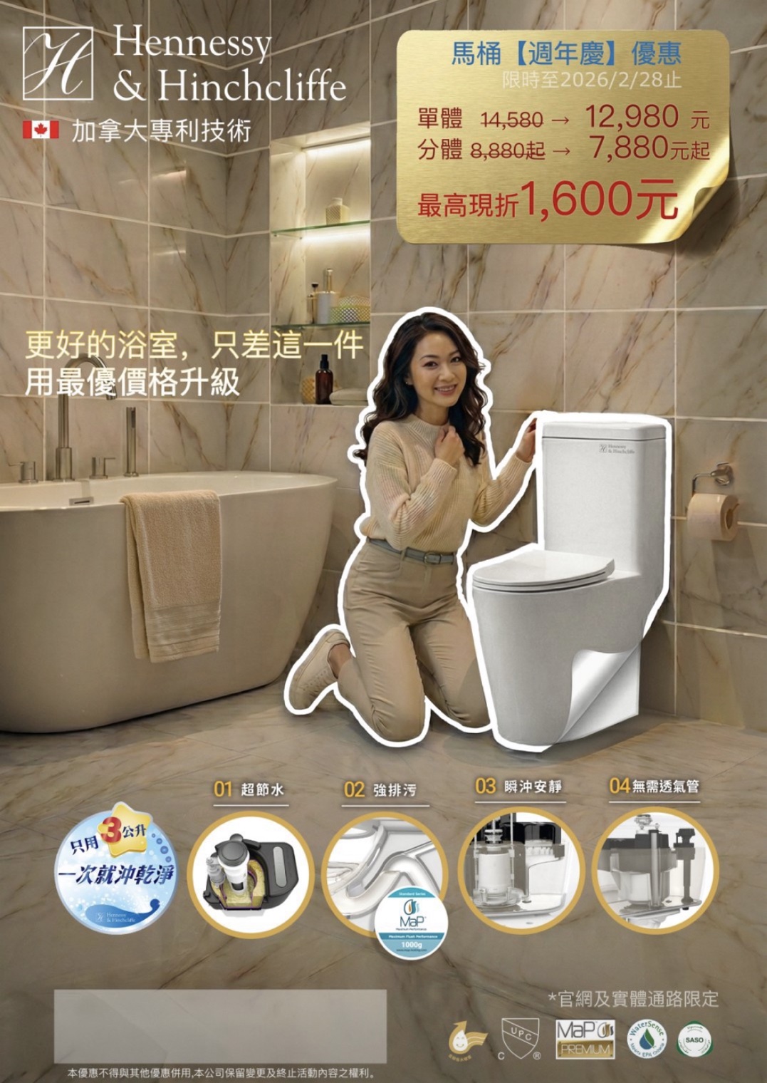 * Hennessy & Hinchcliffe 馬桶每顆都有【真空吸力專利】 主要可以根據您家裡馬桶的管距 來挑選馬桶,現在有【週年慶限時價格優惠(活動至 2026/2/28止)】
