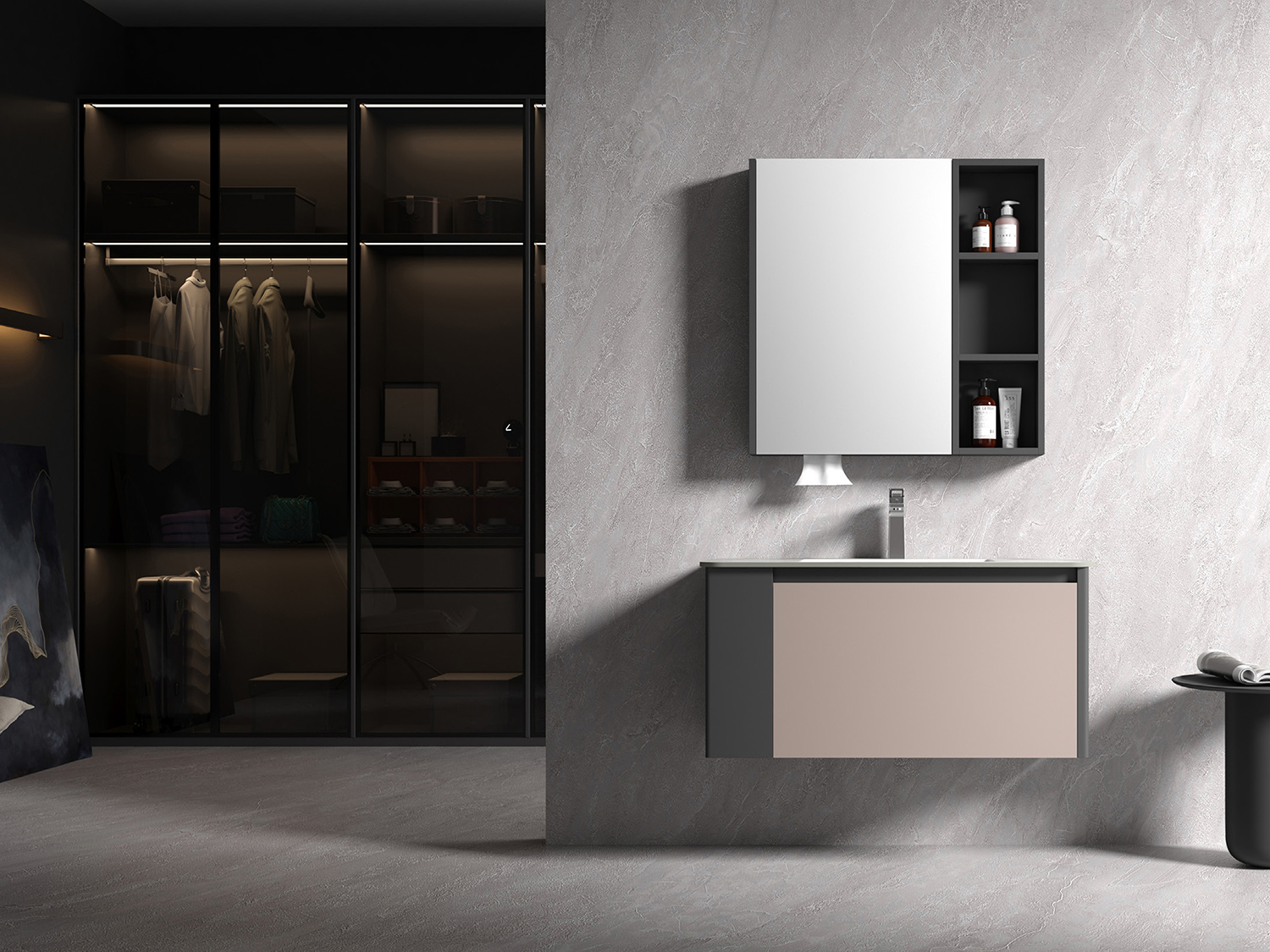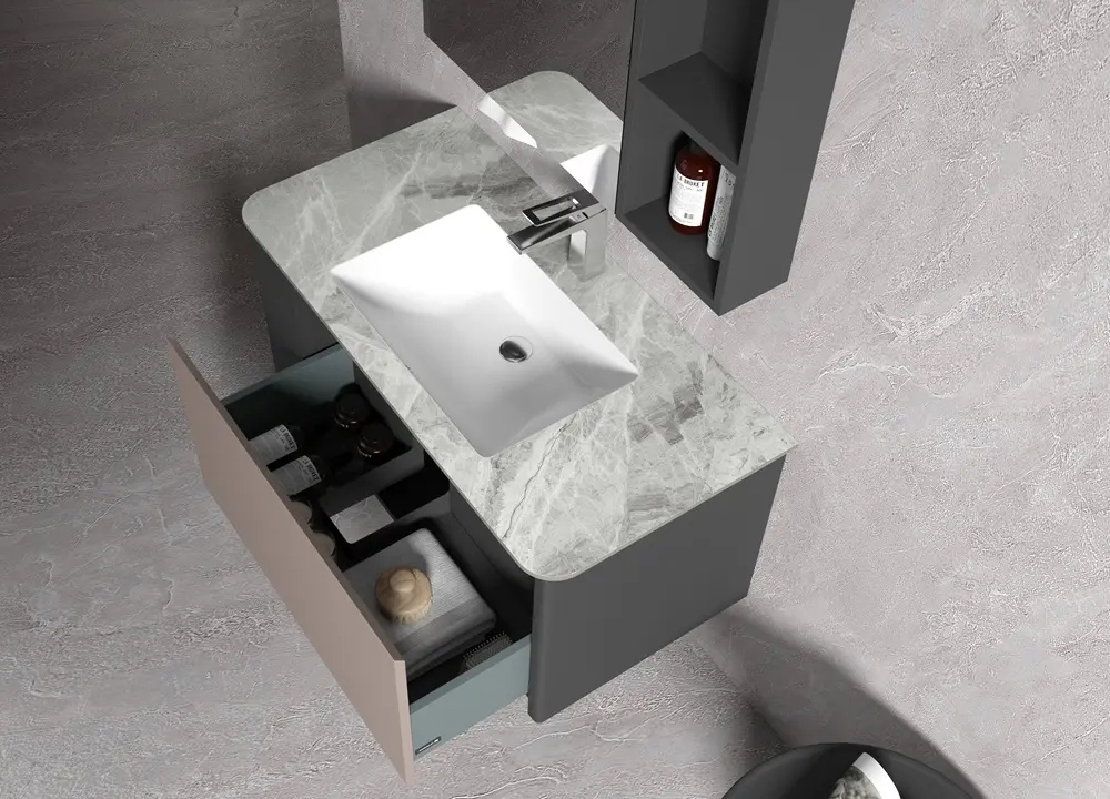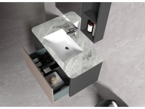• 型號:KQ-S3511不鏽鋼烤漆浴櫃(左)/H100R(義大利淺灰岩板)