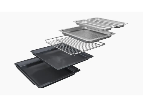 配件:淺烤盤, 烤架, 萬用烤盤, 大深帶孔蒸盤, 中深帶孔蒸盤, 中深實心蒸盤