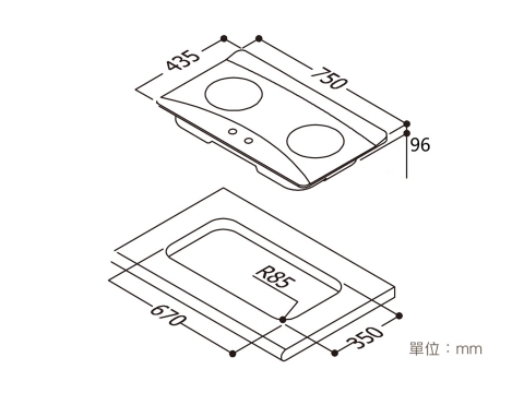 挖孔尺寸 :W670 × D350(R85) mm