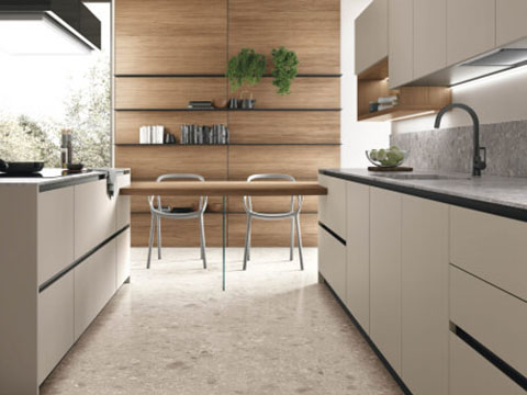 Diagonal 手柄造型,以其獨特凹槽的造型,繪製出對角線的形狀。創新的設計,與您精心挑選的飾面和材質,將廚房門片轉變為獨特的元素,以環境為特徵,並以其風格定義空間。