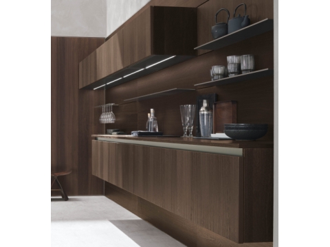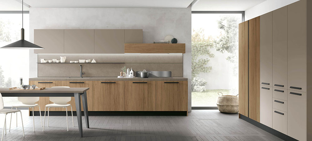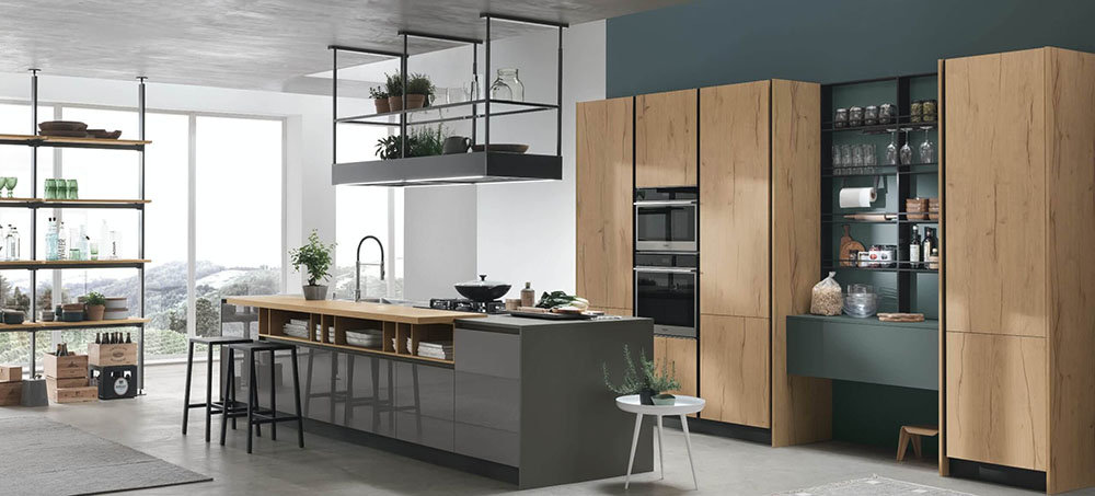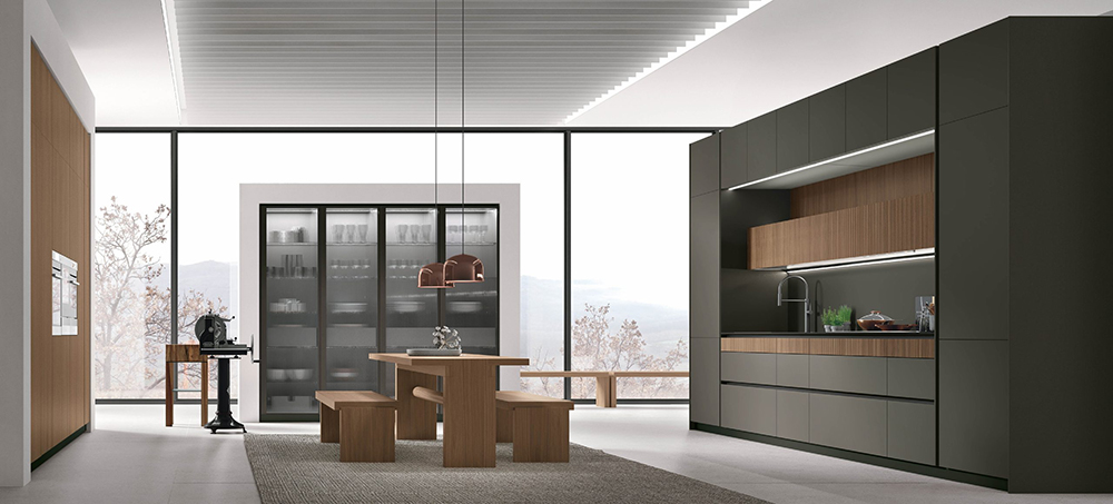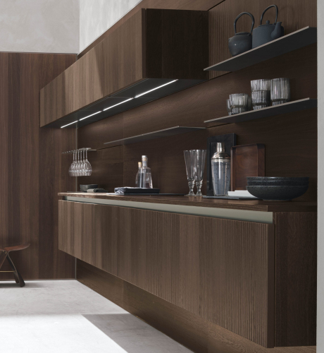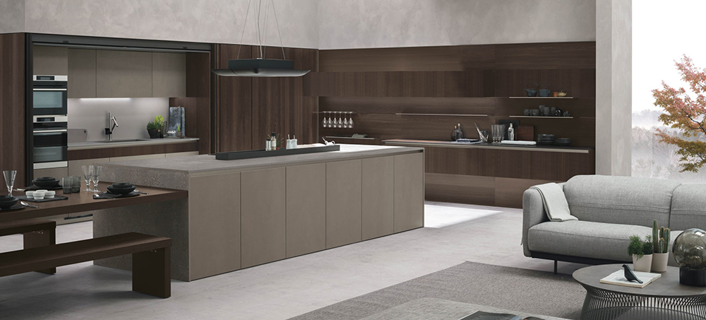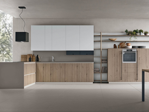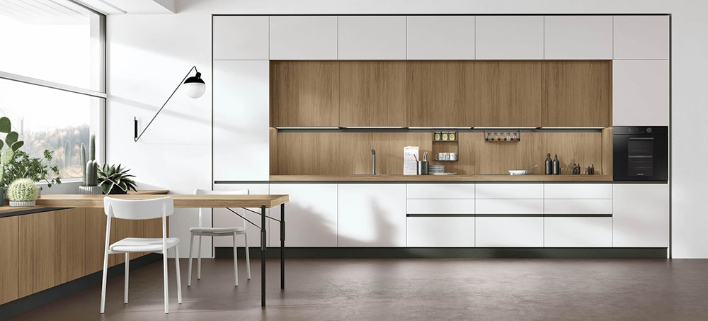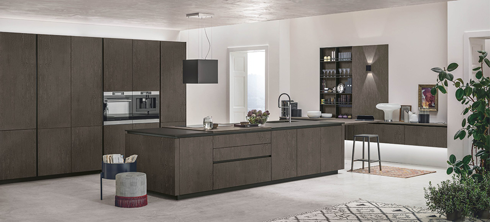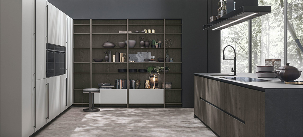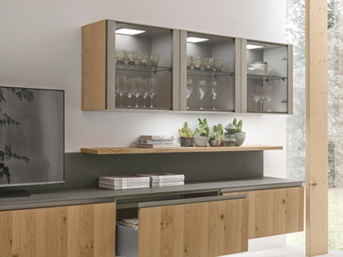Natural 的主要特點是板條橡木門,它以五種色調表達了木材的真實紋路,反應出廚房家具融入現代生活。自然材料的魅力在於,結合了不斷進化的巨大模組化,為廚房系統帶來更大的元素深度和高度,提供最大的收納容量。