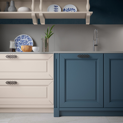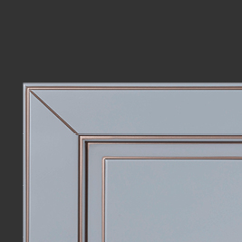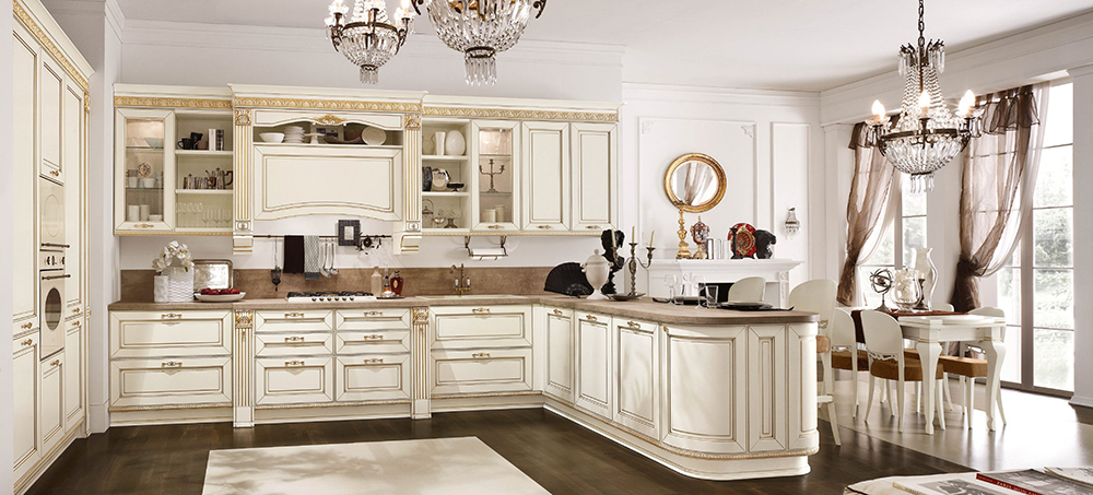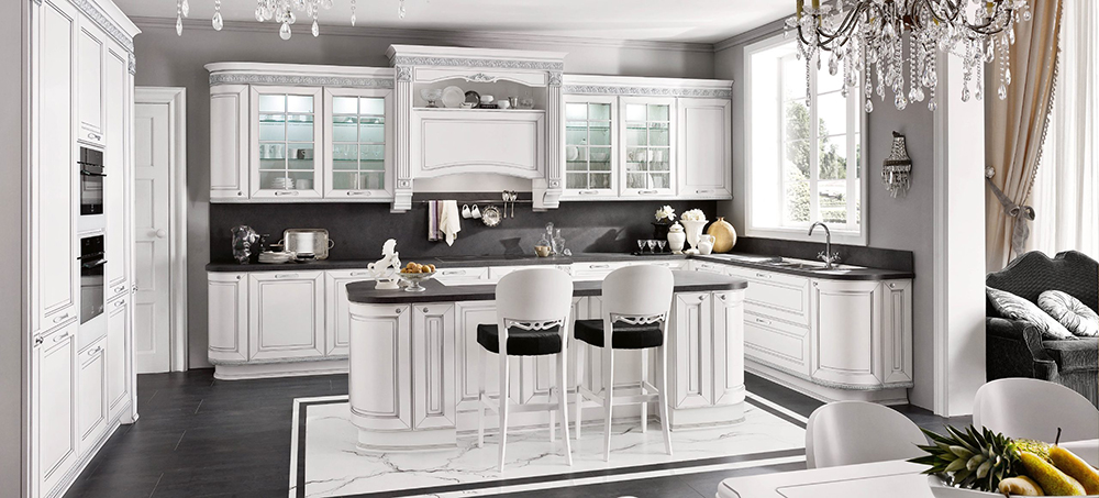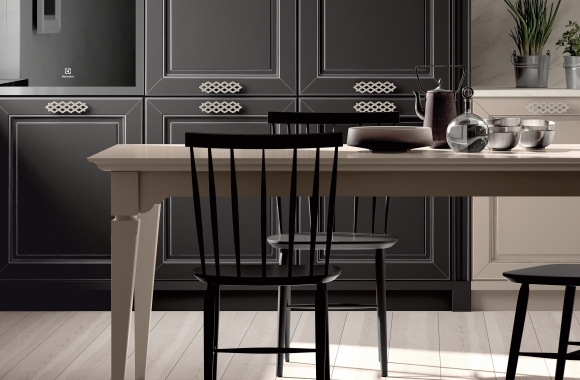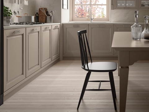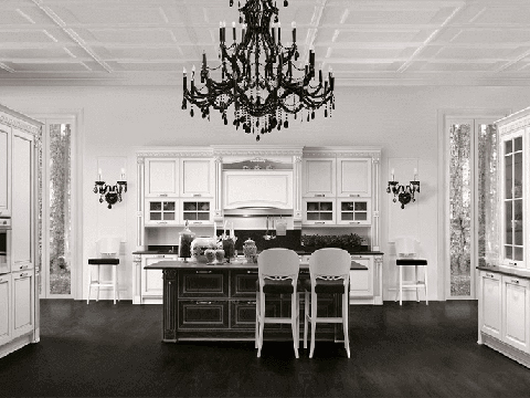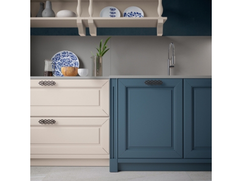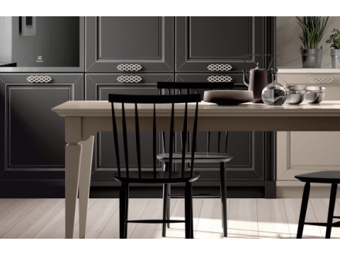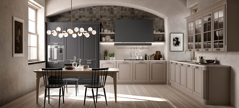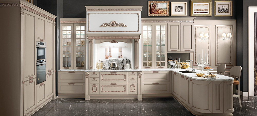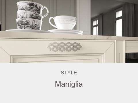 Dolcevita 系列在經典的面飾基材上,採用雙色調刷手法勾勒出金屬陰影層次,增添華麗貴氣的氛圍,櫃楹及上簷造型,演繹中世紀古典藝術元素,巧妙將古典時代與現代生活融為一體,在優雅與經典品味氛圍中,打造永恆優雅的廚房。